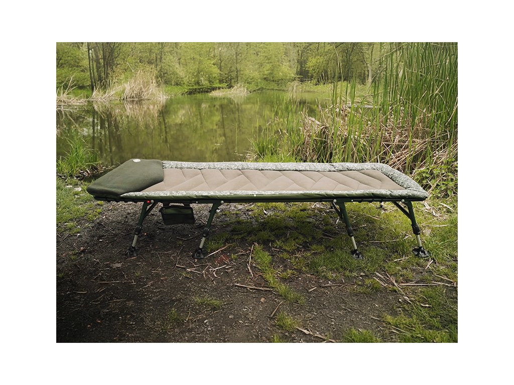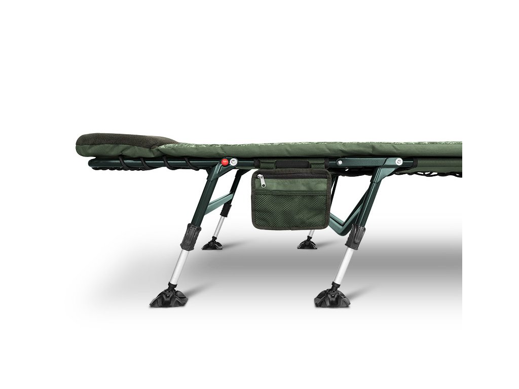 Promyšlené nohy a praktické doplňky: Všech 8 nohou je vybaveno robustními, flexibilními patkami, což jim umožňuje dokonale se přizpůsobit nerovnostem terénu a zabránit zaboření. Pár nohou pod hlavou je navíc opatřen zajišťovacím mechanismem, což usnadňuje rozložení lehátka a zároveň zabraňuje nechtěnému sklápění či posunu. Lehátko je vybaveno také dvěma popruhy s masivními klipy na bocích, které zabraňují samovolnému rozevírání a usnadňují tak jeho transport ve složeném stavu. Jako bonus dostanete v základu praktickou závěsnou kapsu, poskytující možnost uložení mobilního telefonu, příposlechu, či dalšího drobného příslušenství přímo na dosah ruky.