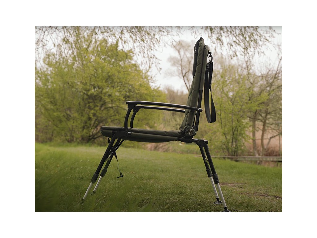 Nekompromisní stabilita a snadný transport: Robustní svařovaná ocelová konstrukce zajišťuje výjimečnou pevnost a šikmý rozestup nožiček garantuje vysokou stabilitu, což ocení zejména objemnější kapraři. I přes svoji pevnou konstrukci je křeslo poměrně lehké. Pro snadný transport jsme křeslo vybavili odepínatelným popruhem, který si lze přehodit přes rameno, a tím uvolňuje ruce pro přenos ostatního rybářského vybavení. Stejně tak je křeslo vybaveno praktickým plastovým klipem, který slouží k fixaci polohy křesla během přenosu a předchází nežádoucímu otevírání.
