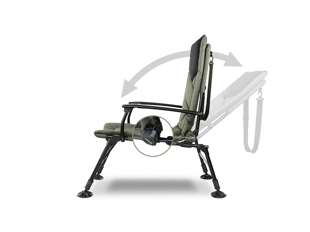 Přizpůsobení jakémukoli terénu: Nohy křesla jsou výškově nastavitelné pomocí pákového mechanismu, což umožňuje dokonale přizpůsobit křeslo nerovnoměrnému terénu při lovu v náročných podmínkách. Zajištění stability polohy křesla zajišťují i pevné otočné patky, jejichž velká plocha zabraňuje zaboření nohou do rozmočeného terénu u vody, což je klíčové pro komfort a stabilitu.