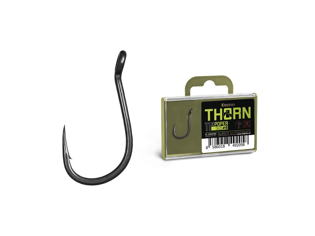 THORN Poper je háček specifický svým očkem vyhnutým do vnější strany. Takové provedení ho předurčuje především pro použití s pop-up nástrahami. Výborně se hodí pro tvorbu moderních a efektivních montáží, jako jsou Chod rig, Multi rig, Zig rig a podobně, kde zajišťuje perfektní prezentaci nástrahy. Díky mírnému zakřivení hrotu dovnitř bude po záseku dokonale sedět v kapří tlamě, což minimalizuje riziko vyříznutí a zvyšuje úspěšnost zdolávání.